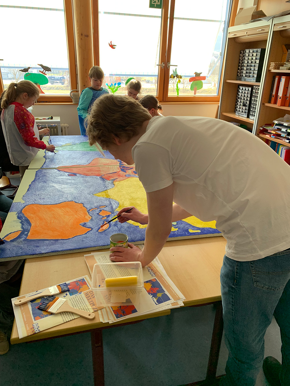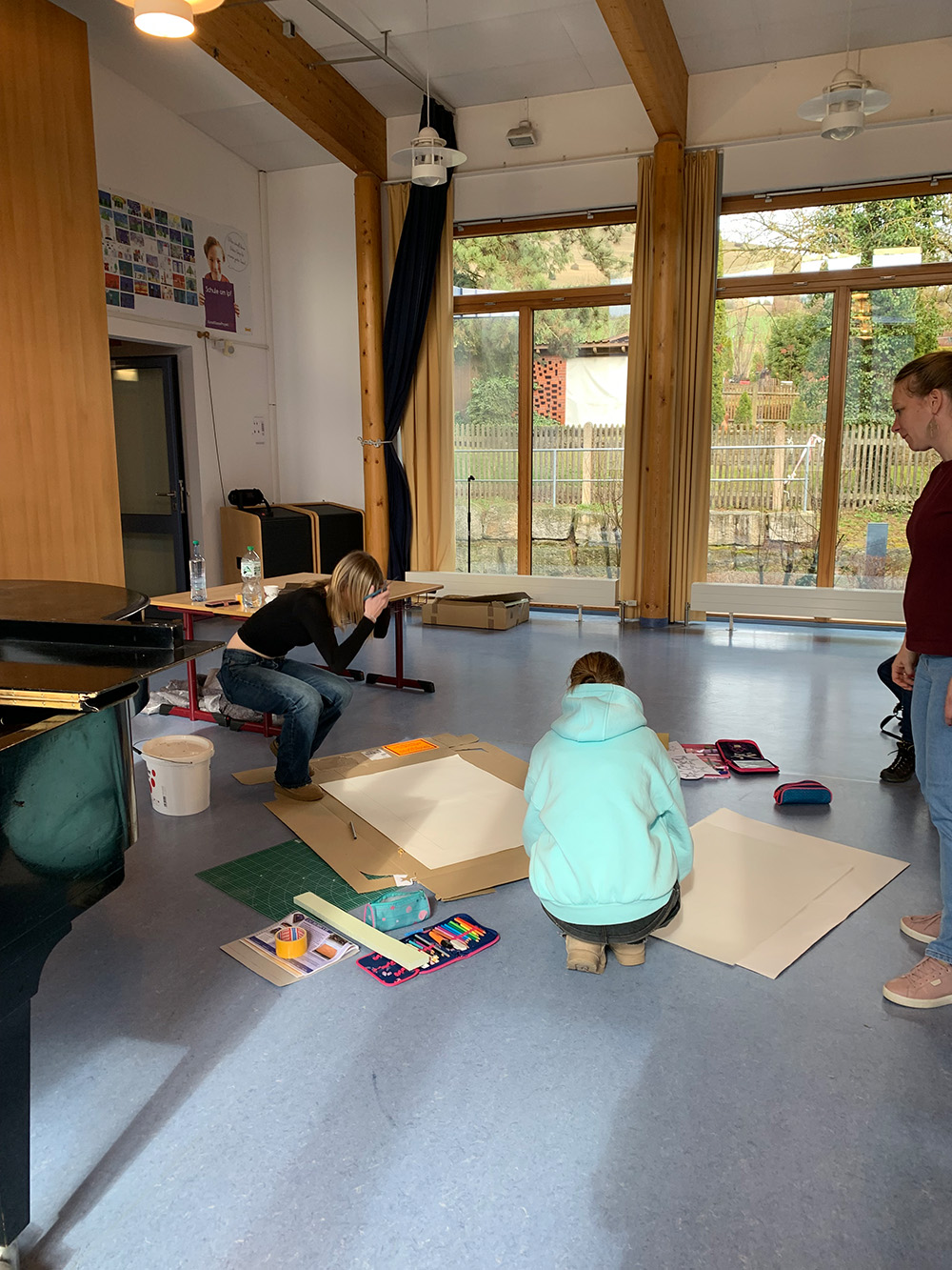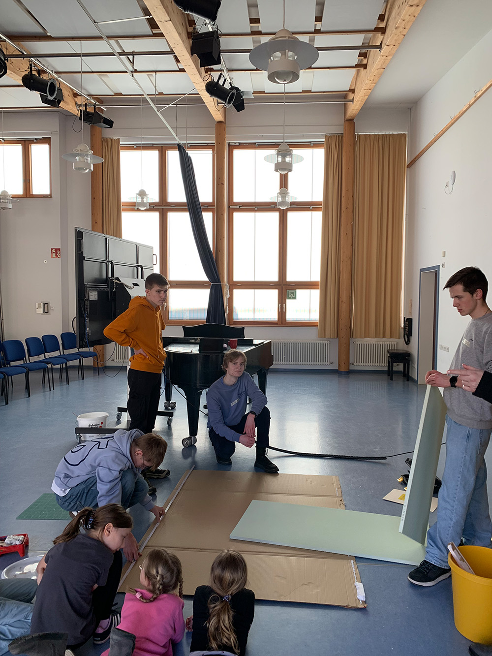 Schülerinnen und Schüler aus der Klassenstufe 10 und der Kunst-AG haben im Februar und März 2026 die Grundschülerinnen und Grundschüler der Schule am Ipf bei der Umsetzung und Gestaltung großer Bühnenbildrequisiten für das Musical „Felicitas Kunterbunt“ unterstützt. Die Zusammenarbeit erfolgte im Rahmen der bestehenden Kooperation mit den Grundschulen.