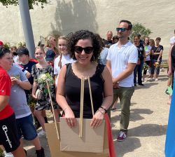 Das ließen sich die Eltern unserer drei achten Klassen nicht nehmen und backten fleißig für den Kuchenverkauf beim Rutenfest. Das Zelt für den Verkauf wurde dankenswerterweise von der Jugendfeuerwehr aufgebaut. Rund 40 tolle Torten und Kuchen kamen zusammen, die bei strahlendem Sonnenschein auf eine sehr hohe Nachfrage bei Kuchenliebhabern stießen. Unter ihnen auch unser Schulleiter Dr. Pascal Bizard, der sich gleich mit 8 Stück Torte versorgte. Verkauft wurden die Kuchen von Schülerinnen und Schüler der achten Klassen, wobei sie von Eltern und Lehrern betreut wurden. Insgesamt kamen knapp 1000 Euro Reingewinn für die drei Klassenkassen zusammen! Allen Kuchenbäckerinnen und Kuchenbäcker, Verkäuferinnen und Verkäufer sowie allen Mithelfenden ein großes Dankeschön für ihre ehrenamtliche Unterstützung! Ein besonderer Dank ergeht auch an die Eltern Romy Bihr, Maria Deubler, Julia Weber, Marcus Stark, Franz Stark und vor allem auch an Frau Regele sowie an die Lehrkräfte David Hinze, Bianca Krohn-Hendrich und Jennifer Mailänder, die den Kuchenverkauf mit organisiert haben.