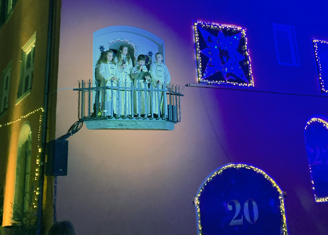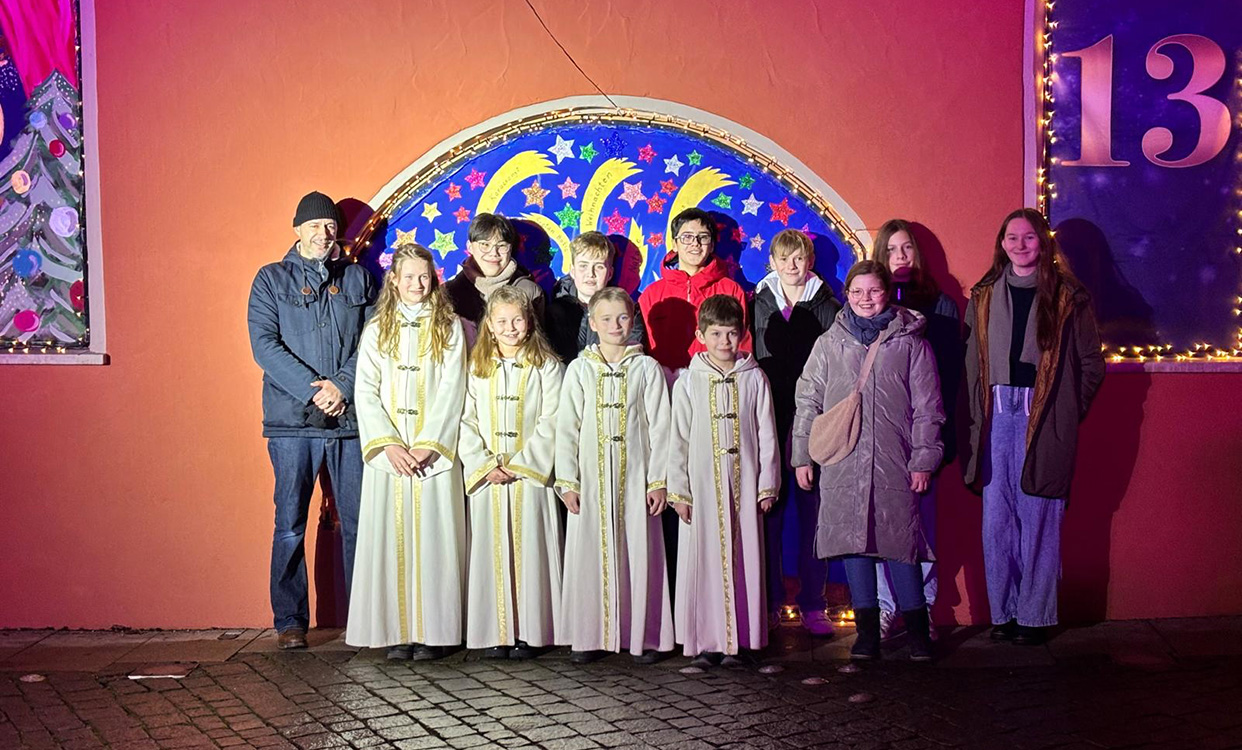 Umrahmt wurde die Öffnung vom vorweihnachtlichen Beitrag unserer diesjährigen OAG-Engel Leni Vaas, Pauline Späh, Jamie Hübert und Jonas Ilg aus der Klassenstufe 5, die den zugehörigen Märchentext gekonnt vortrugen.